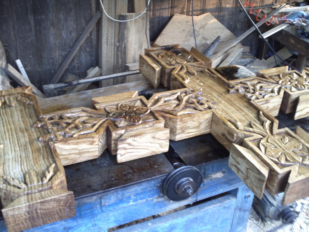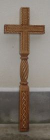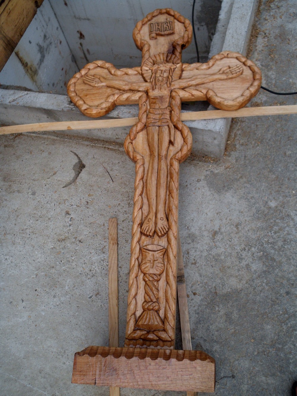 The foot of the cross can be carved like a rope or may have carved decorative elements applied from different wood species to create a nice contrast. The cross can have side décor that gives balance and uniqueness: springs, joints wooden panels carved with saints and angels. Crosses can be covered with shingles, can be oiled or varnished or even painted, thus ensuring a better resistance over time. Using the oak tree as material, being a hardwood becomes more resistant to sculpture and is not fragile like fir wood, which is less used when you wish to decorate the cross.