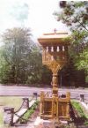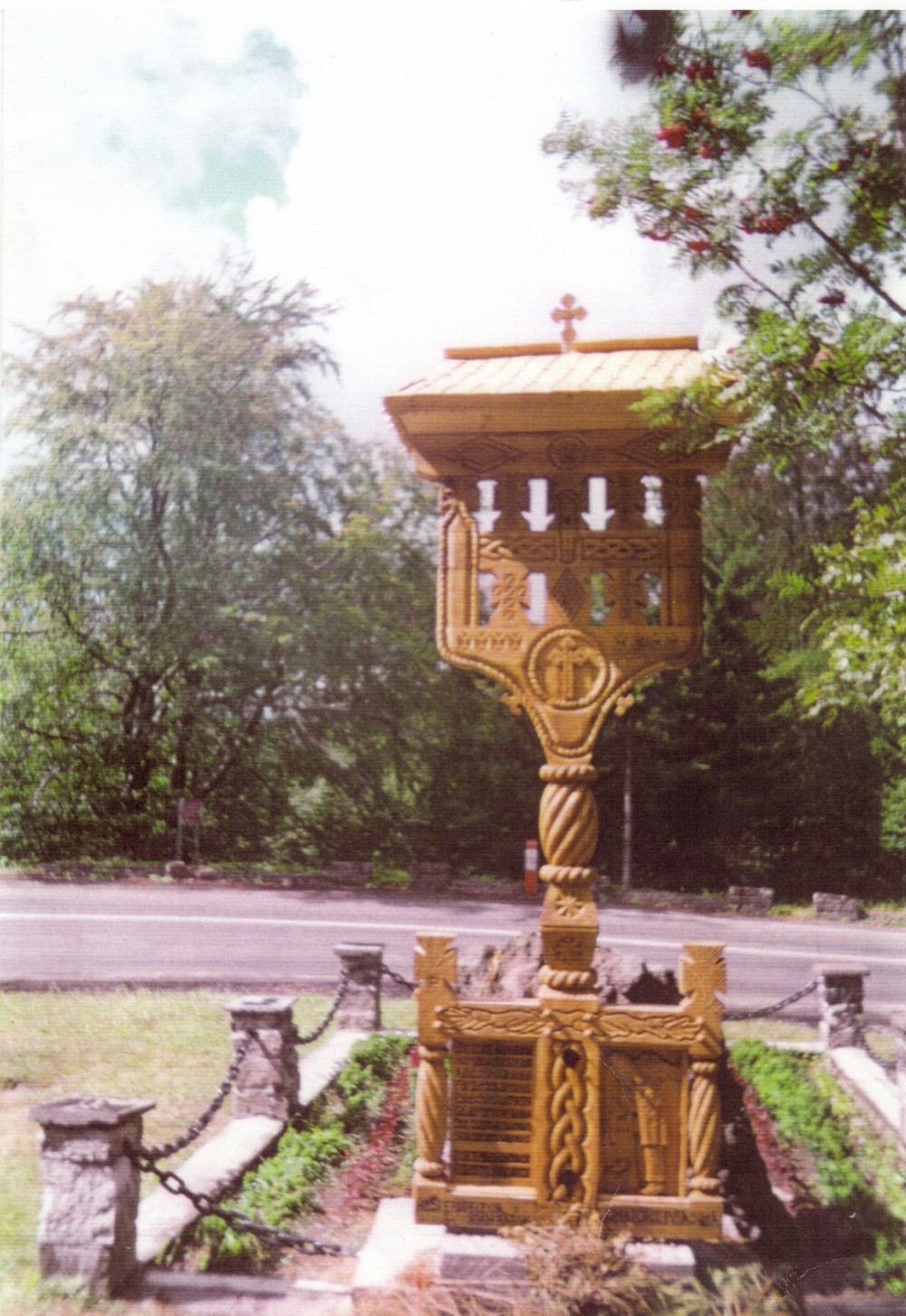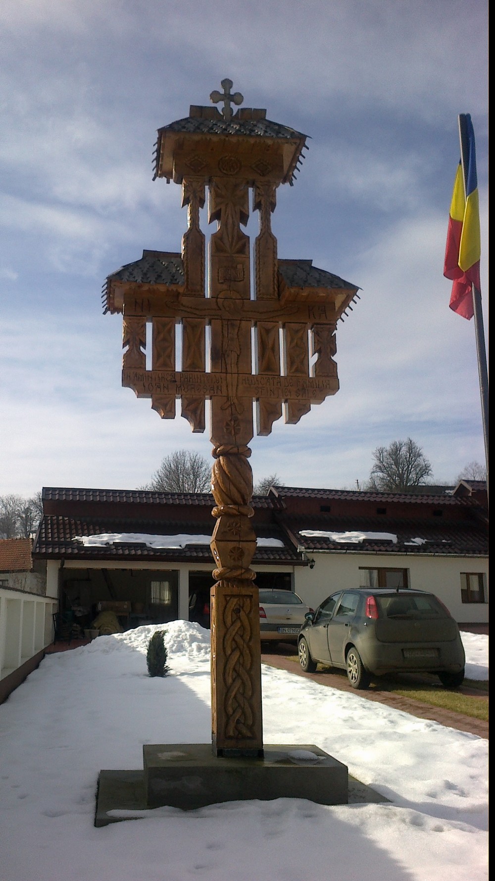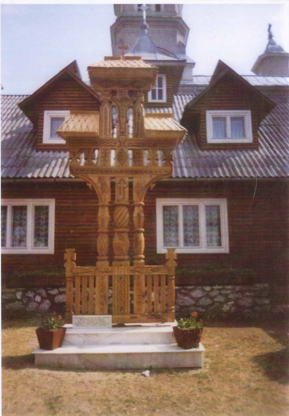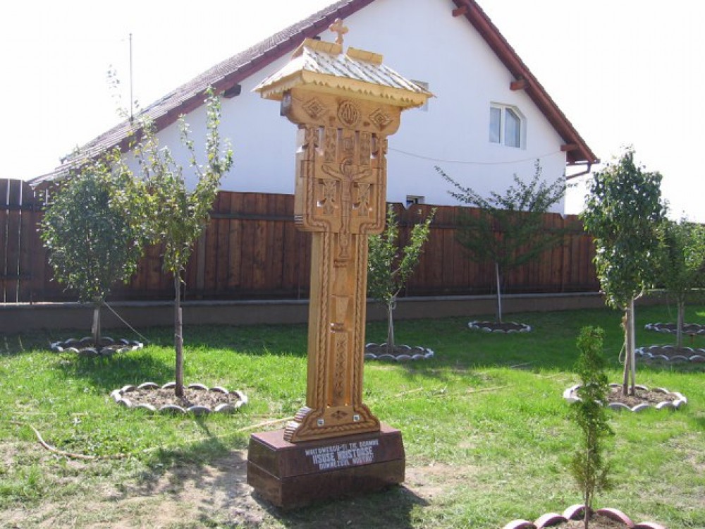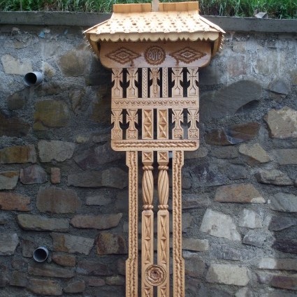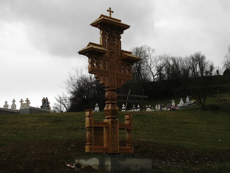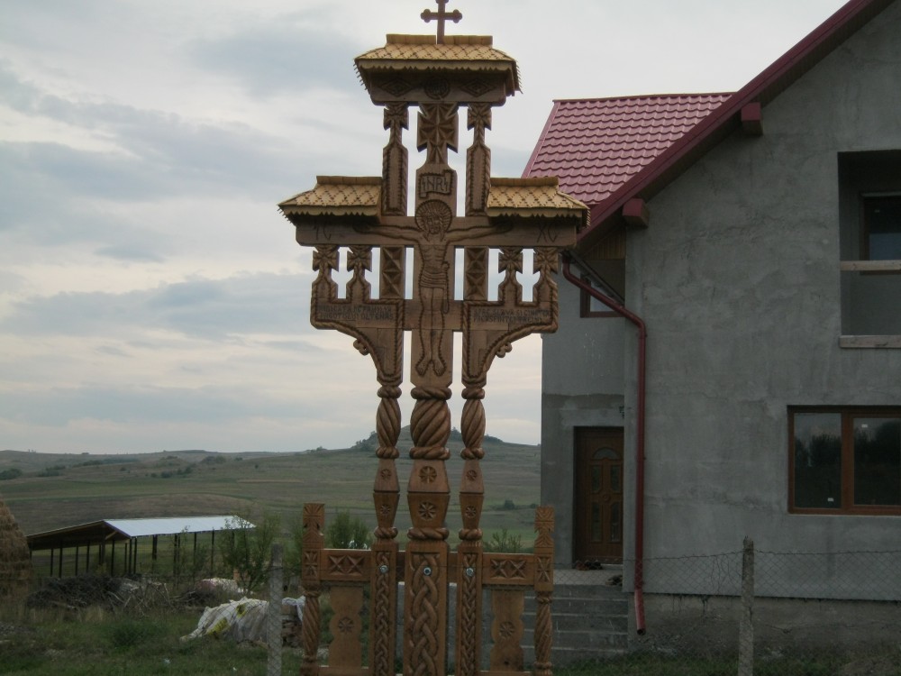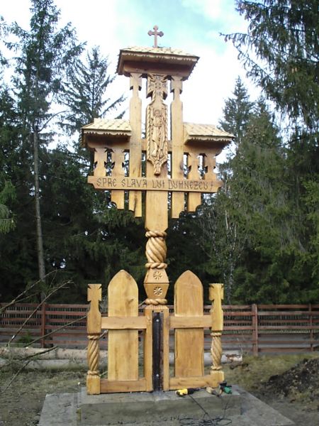 - The small crucifix with 3 small pillars- from the bottom up are: a base of 70/20/10 cm, embarking on three vertical pillars about 10/10 / 200cm, which intersect on top with two elements placed symmetric distance from each other, dimensions 10/10/70 cm. The work ends with a crown of 20/10/90 cm, and on this crown there are beaten shingles roof, whereon a cross is. Regarding the sculpture on this, you can find traditional motifs, crosses and crucifixion scene Savior.