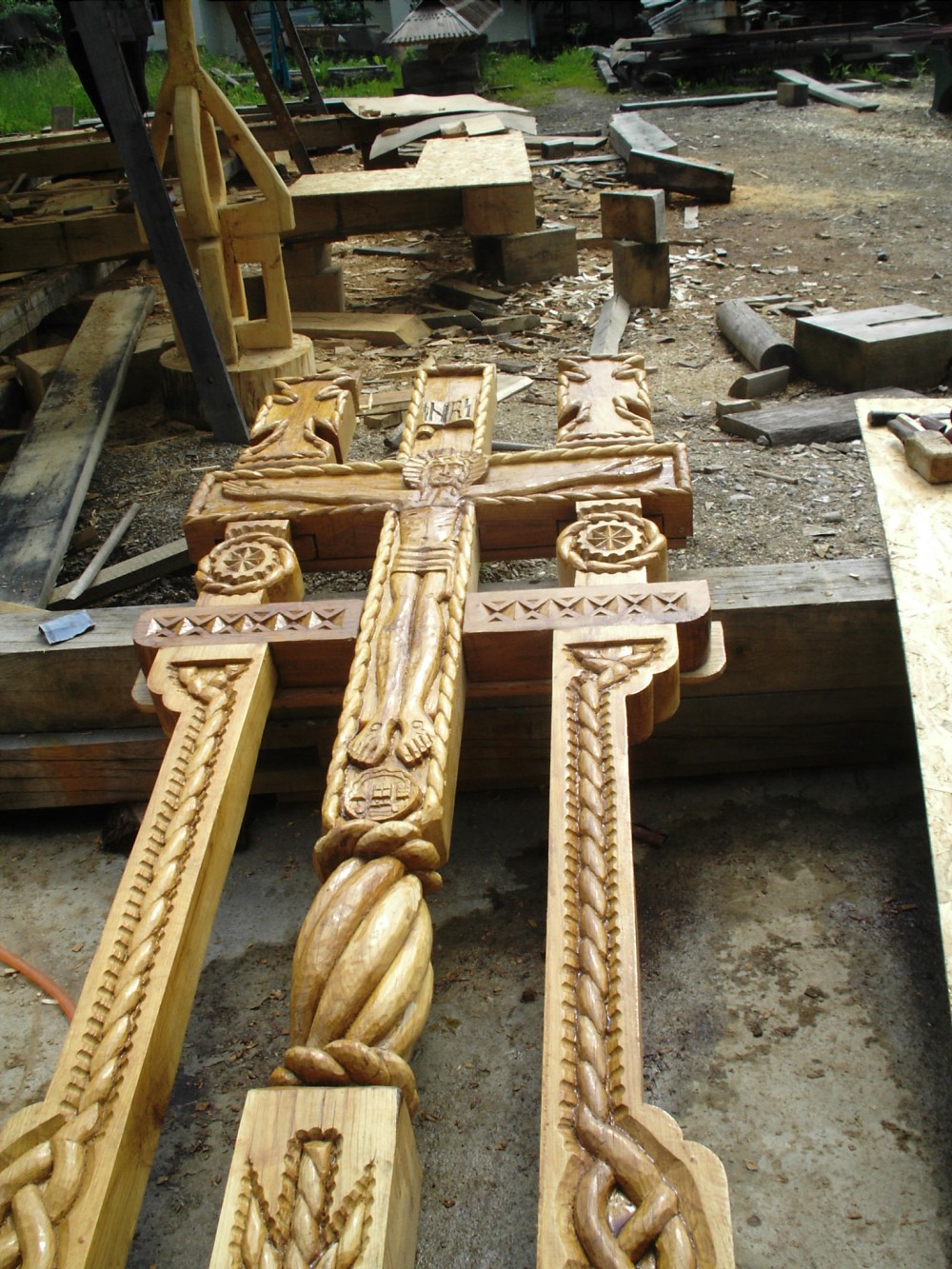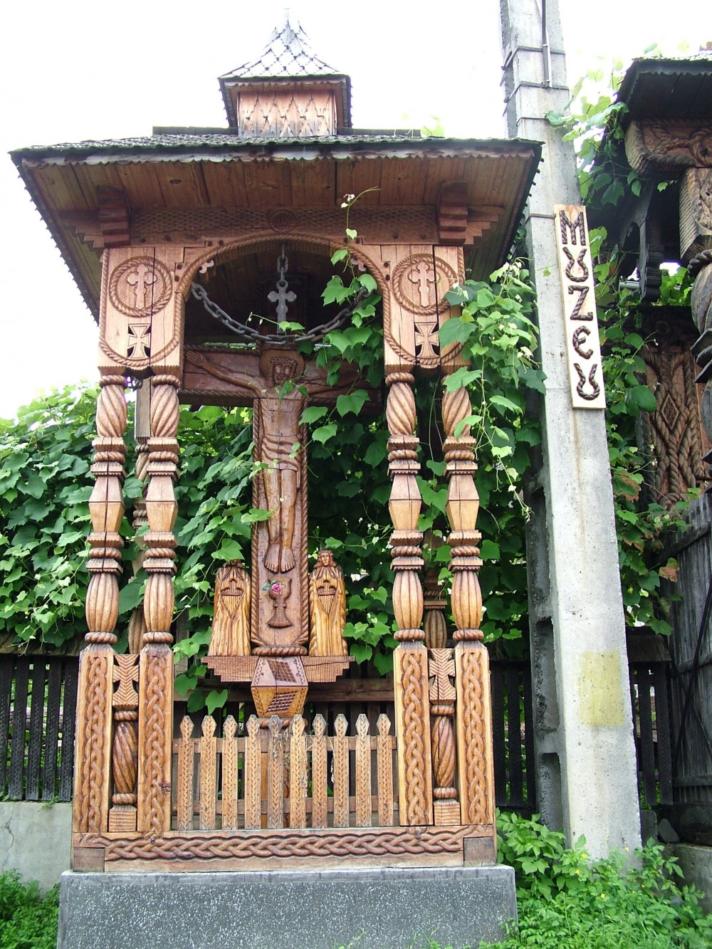 The models on the crucifixes are countless, in most regions of the country they are made of boards with a thickness of 5-10 cm and average height of 2m50. The only place in the country where crucifixes are massive, having a hard main pillar (with an average of 30/30 cm and a height of 4m) is Maramures. On this massive pillar the crucifix is made, but also the other elements are equally impressive, for example most of the components have a width of 12-20 cm and 10-16 cm thick.