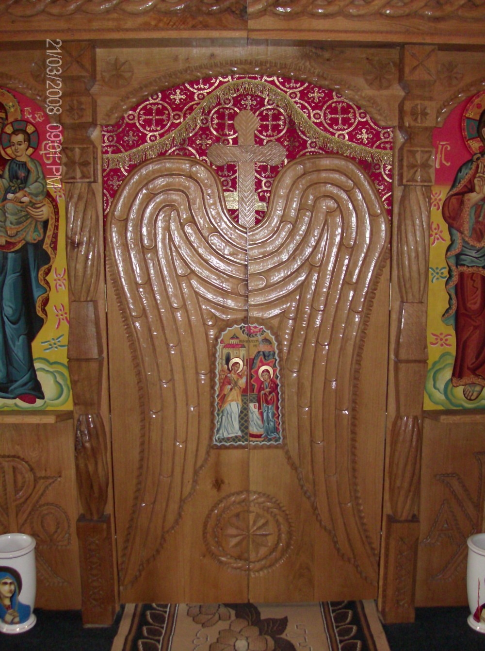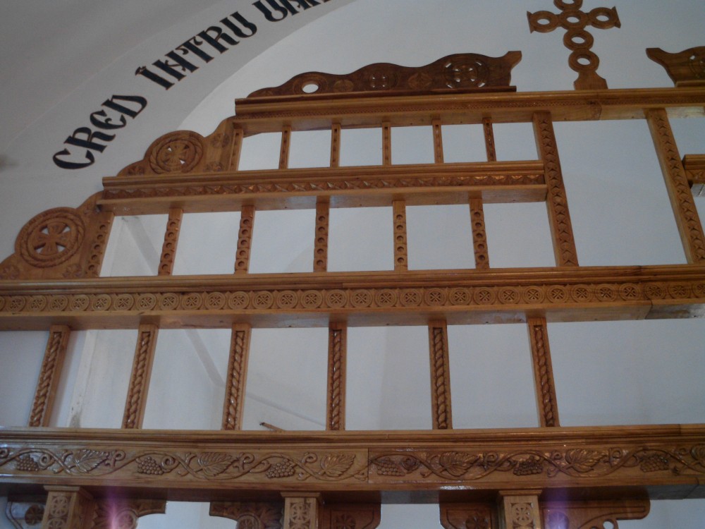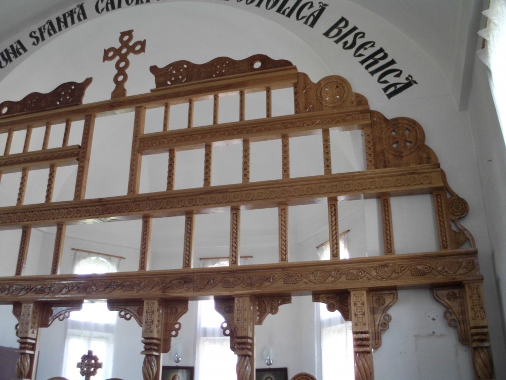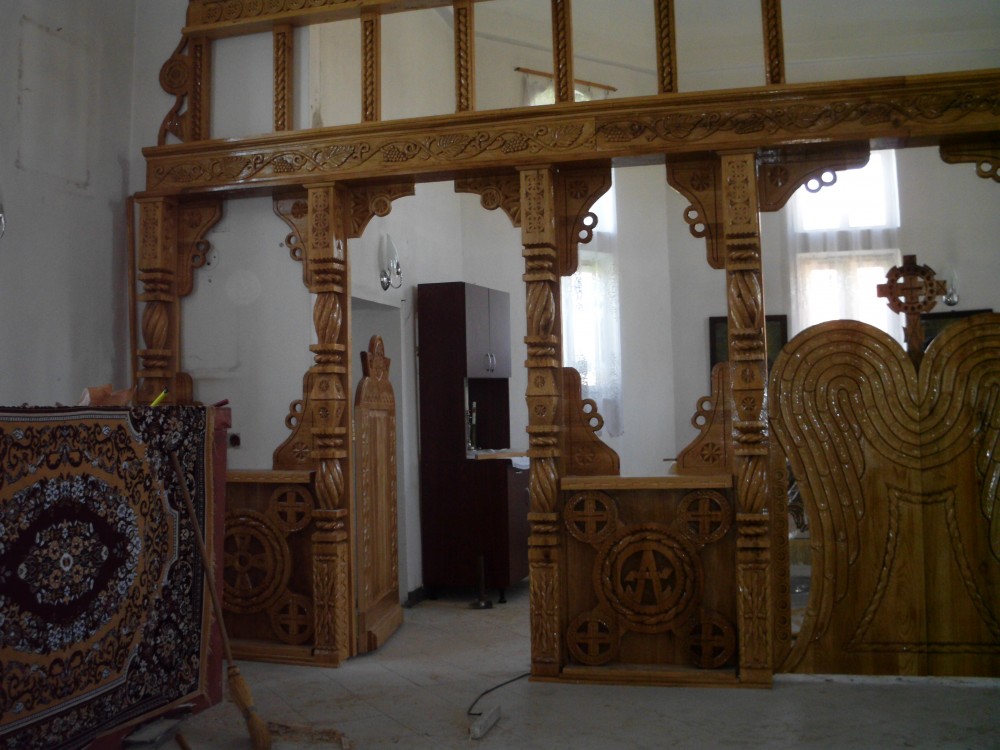 The iconostasis must comply with the structure and design: in the middle are the imperial doors, followed by the Deacon`s doors, and above are spaces for three or more rows with icons, and the cross in the middle framed by other two icons. The most common models are the iconostases which have a very complex sculpture, loaded with many vegetal-stylized floral motifs representations. It is worth mentioning that the sculpture on the iconostasis is done mainly through professional machines, which make them fit in the type series. Although in the finishing chisels are used, the iconostasis are very similar to each other. A major limitation of these types of iconostasis is the lack of adaptability to space of the church, sometimes necessary handmade additions spoil the look of the work unit. In contrast to the above, we bring creativity and originality combined with canonical requirements. Although some equipment is needed for the preparation of the materials, the sculpture is entirely manual. In terms of structure iconostases have many dimensions: the ones for the cathedral, much higher, the churches and the small chapel.
